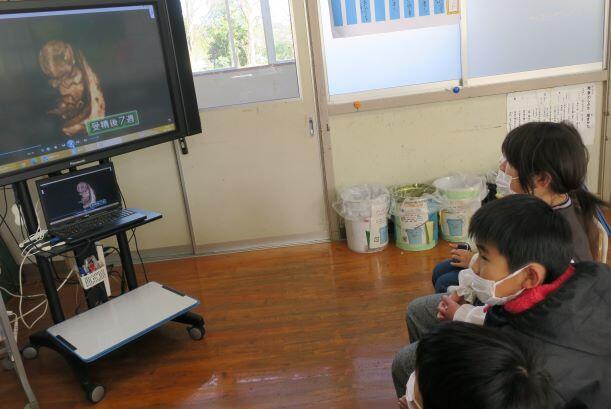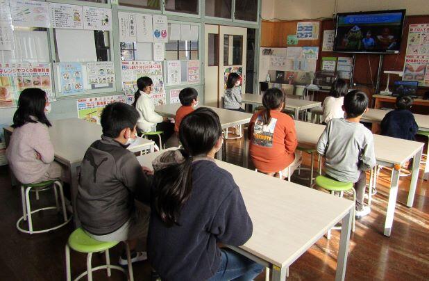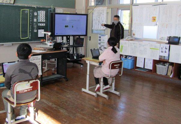 1・2年生はモニターで、先生と確認、木琴とタイコも1・2年生の鍵盤ハーモニカに合わせて練習しました。