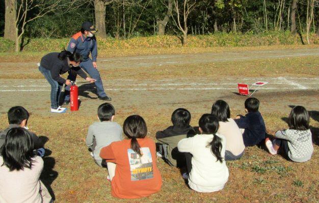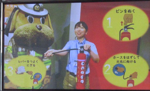 避難完了まで1分4秒でした!消防署からは3人の方が来校されました。はじめに消火器についての説明と実演です。