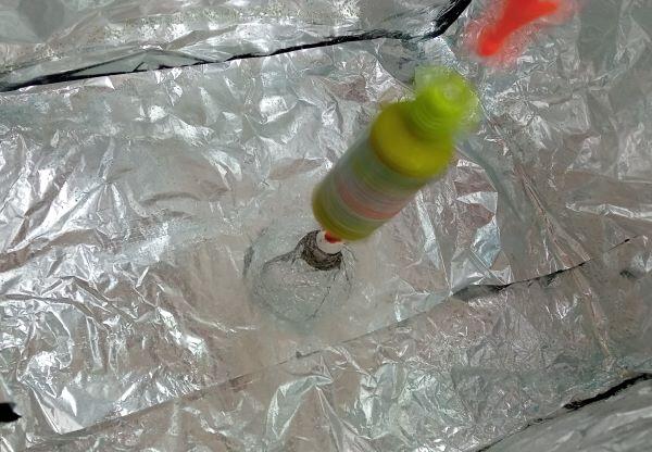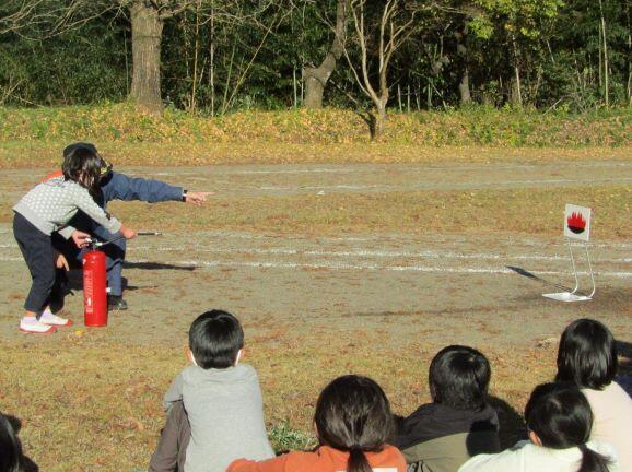 子どもたちも交代で消火器の訓練をしました。火の絵の下の黒い部分に当てるようにします。看板が倒れます!