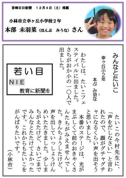 12月6日(月) 12月3日の土曜日付の宮崎日日新聞に本校の子どもの作文が掲載されました!先月に続いての掲載です。
