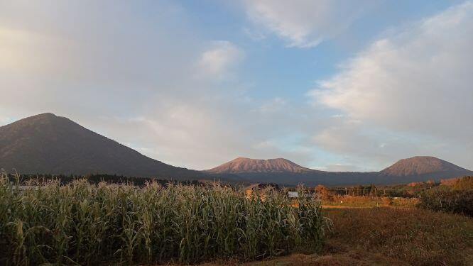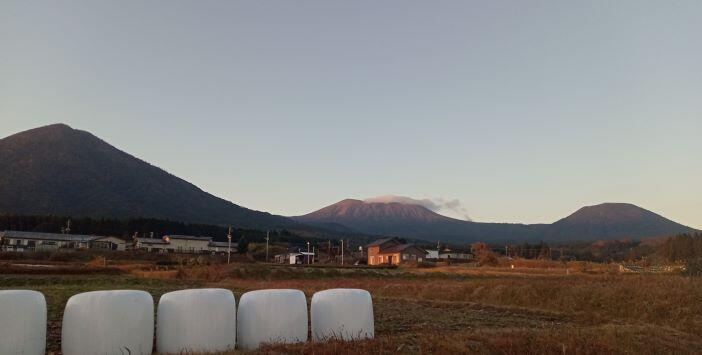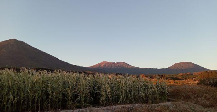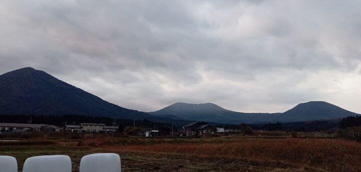 この日の朝の幸ヶ丘三岳です。韓国岳から噴煙が上がり、右側へ流れて・・・という感じでした。(※韓国岳は噴火していませんよ!)