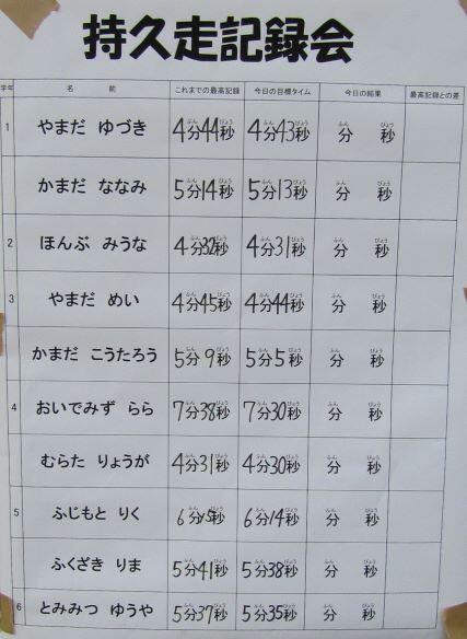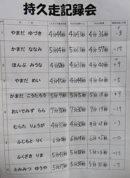 下級生も応援しながら走りました。最後の子どもがゴールしました!記録一覧です。ほとんどの子どもがベストタイムを