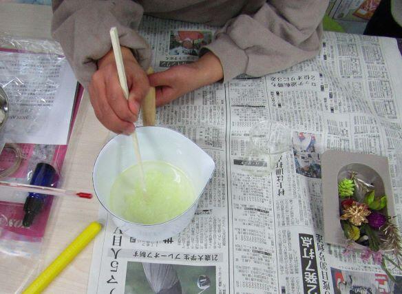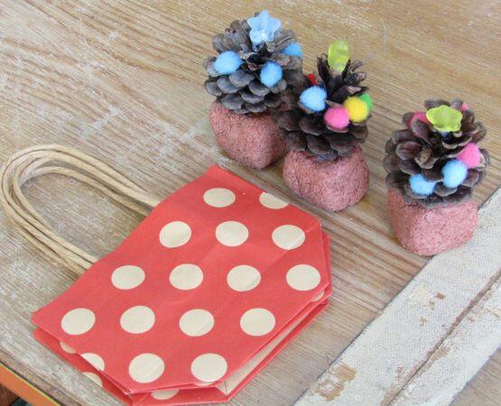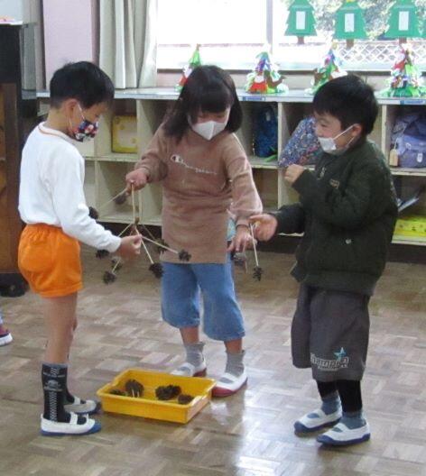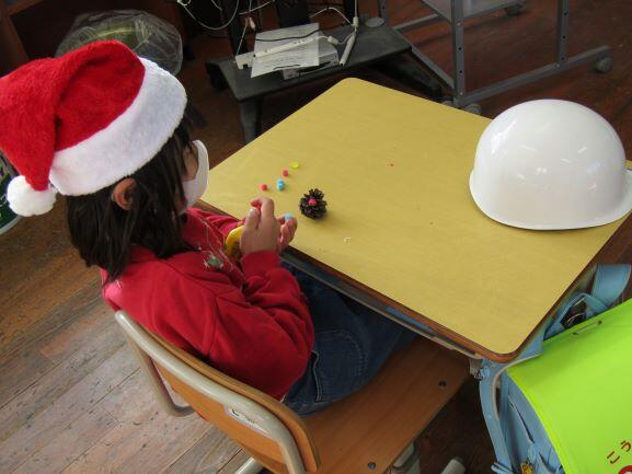 松ぼっくりに何かをつけています。教卓でも・・・。ミニツリーを作っていました。自分だけのオリジナルツリーです!(^_^)v