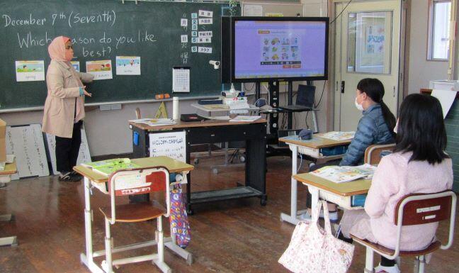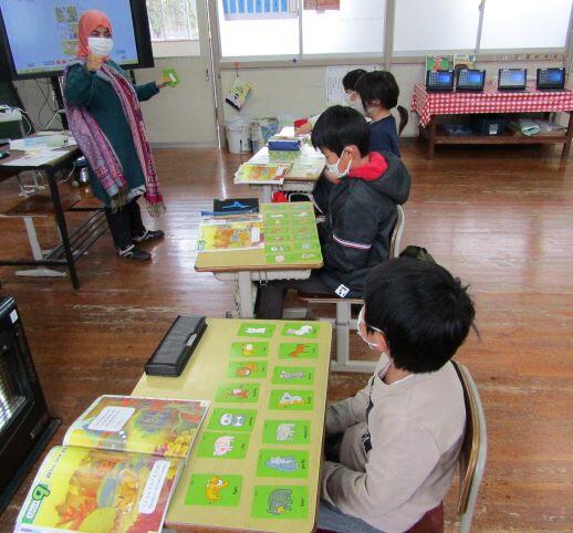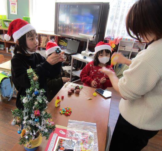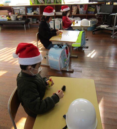 放課後、荷物を届けに、上級生の授業終わりを待つ、1・2年生の教室を覗いてみました。サンタの帽子をかぶった