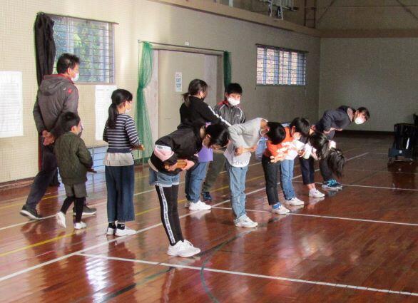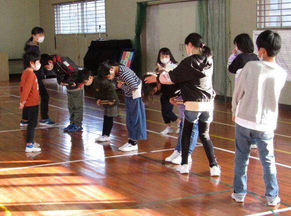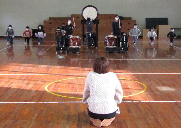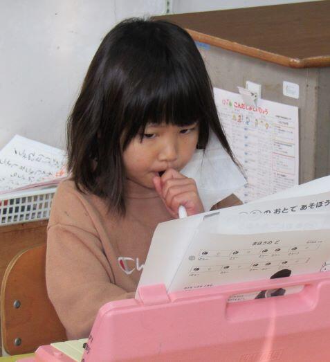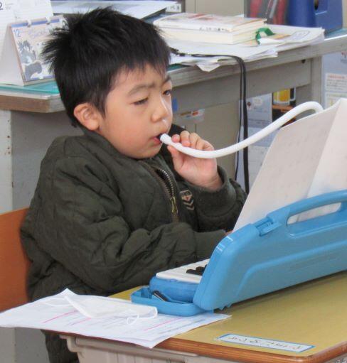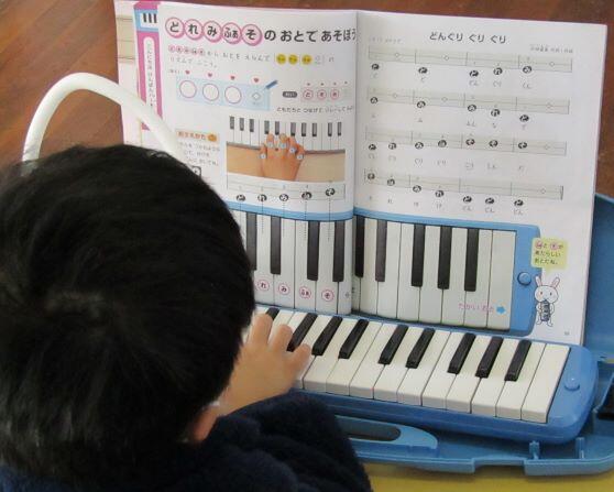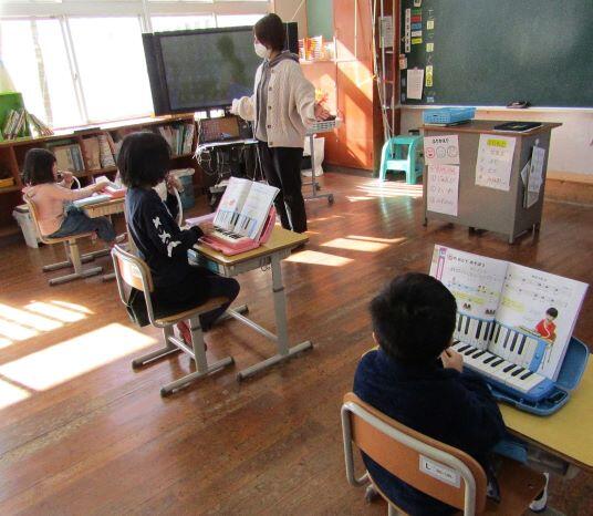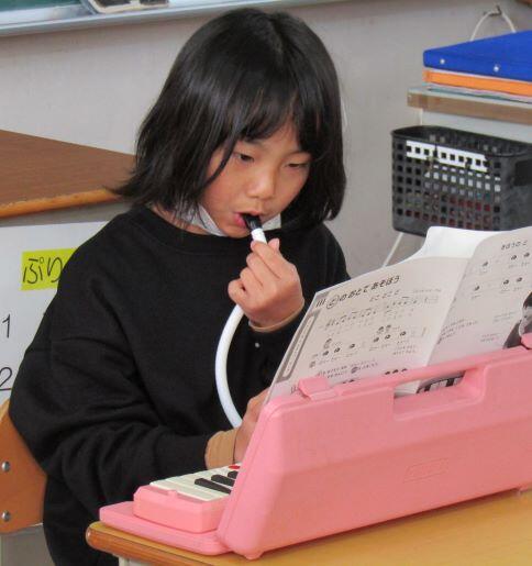 先生とリズム打ちをしました。1・2年生は筆箱を鍵盤ハーモニカに見立てて、練習しています。