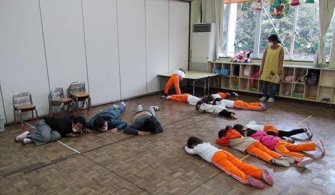 下のように、服に火がついてしまったら、倒れて転がることなのです。転がって火を消すのですね!うんうん。