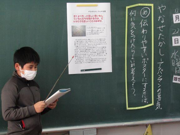 をめあてにして、学習しました。まずは自分の作成したポスターについての説明です。