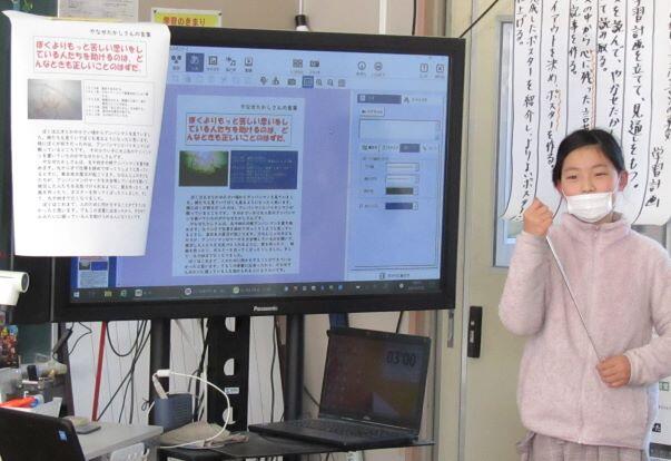 再構成した自分のポスターの発表をしたあと、まとめを自分の言葉で書きました。授業の終わりです。