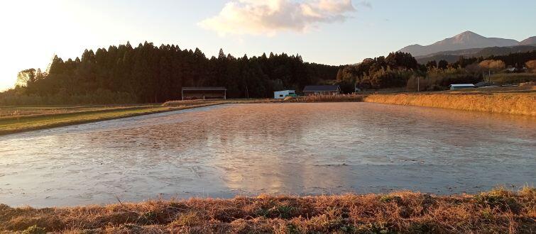 前日はこの冬一番の冷え込みでした。気温も8時前ですが氷点下になり、水を入れた田んぼも氷が張っていました。