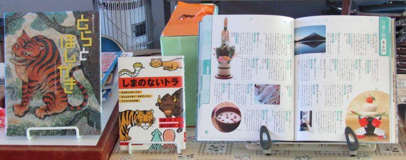 お正月の物や来年の干支のトラに関わる本などです。協力員の先生には、月ごとの掲示や図書貸し出しの管理等、大変、