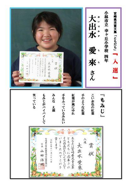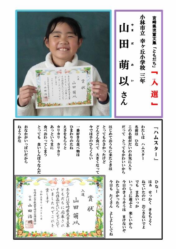 ⇒ 令和3年度宮崎県児童文集「ともだち」入選(3年山田萌以さん).pdf