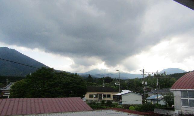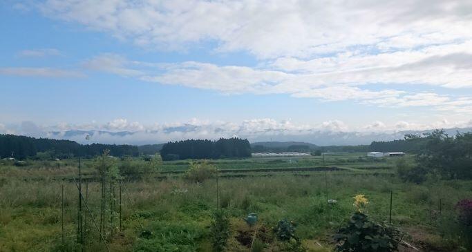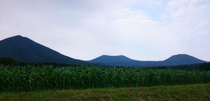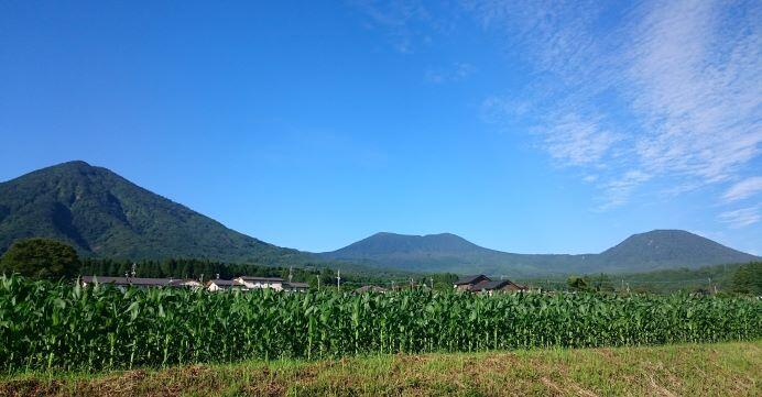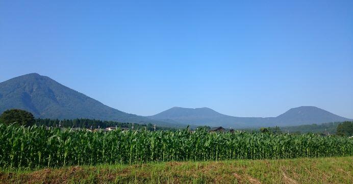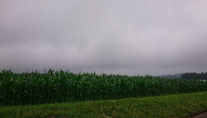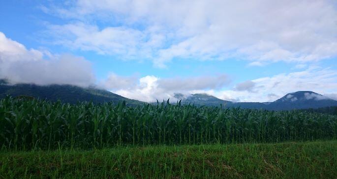 この日の朝の幸ヶ丘三岳です。雲がかかっていました。手前のトウモロコシがずいぶんと大きくなっていました。反対側の山々にも雲がかかっていました。緑がずいぶんと濃くなっているように思えました。