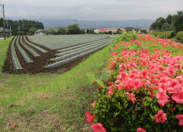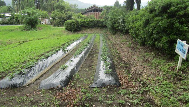 ツツジの裏側の畑にはサツマイモが植えられていました。学校の子ども農園でもサツマイモが植えられています。学校の