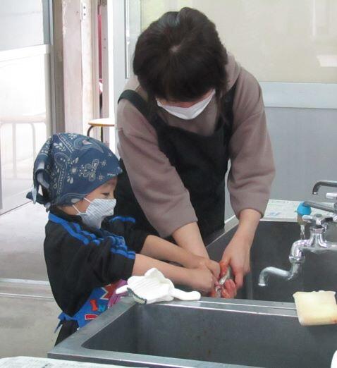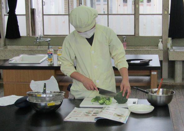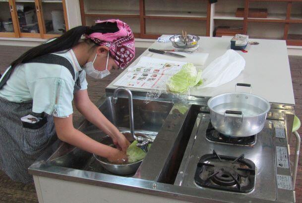 野菜を切ったり、洗ったりします。左手の使い方は・・・OK!ブロッコリーは塊を切って分けます。キャベツは1枚ずつ