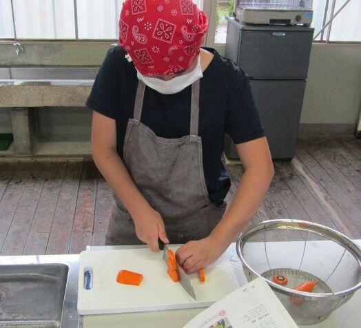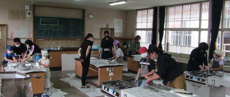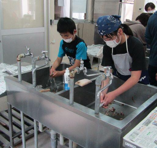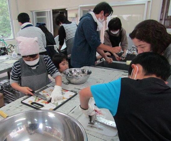 家庭科室でもさばきました。上級生は包丁の使い方も上手になっていますね。下級生は洗い流しの担当かな?
