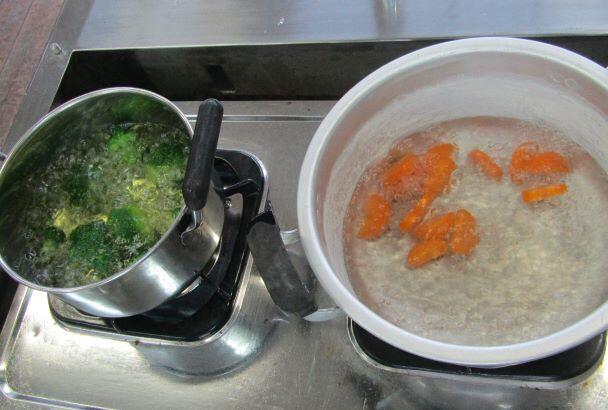 ゆで野菜をつくります。野菜はにんじん、ブロッコリー、キャベツの3種類です。3人いるので、一つずつ作りました。