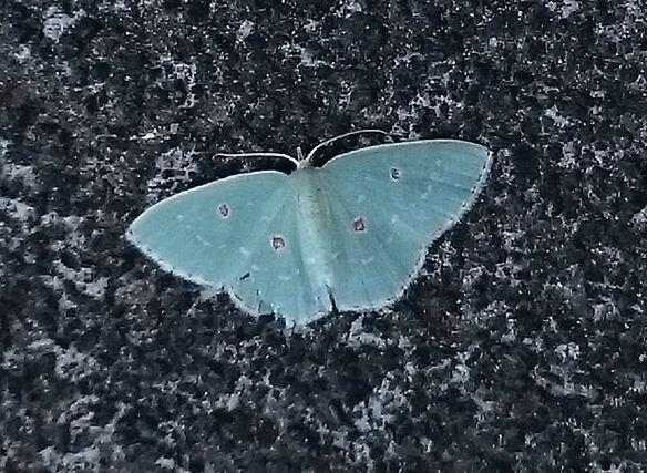 この日の朝の幸ヶ丘三岳です。少しかすんでいるように感じましたが、雲一つない三岳を見るのは久しぶりでした。また、この日の朝、玄関先で今度は蛾(が)を見つけました。羽を閉じていたので、はじめは気づきませんでした。とっても小さくて羽を広げても1cmくらいでした。ターコイズブルーという色を知っていますか?そんな色の蛾でした。