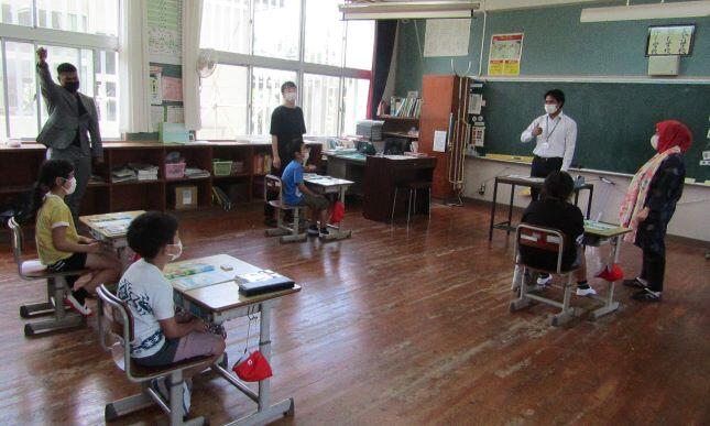 はじめは5・6年生の授業です。自己紹介からハイテンションでした。(^o^) 左側の先生は、フィジー出身で、右側の先生は