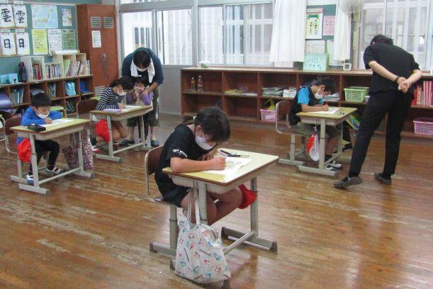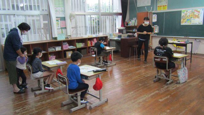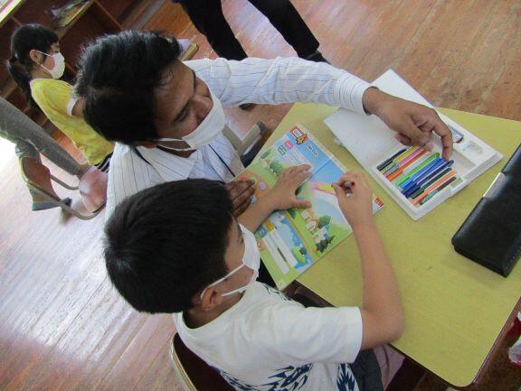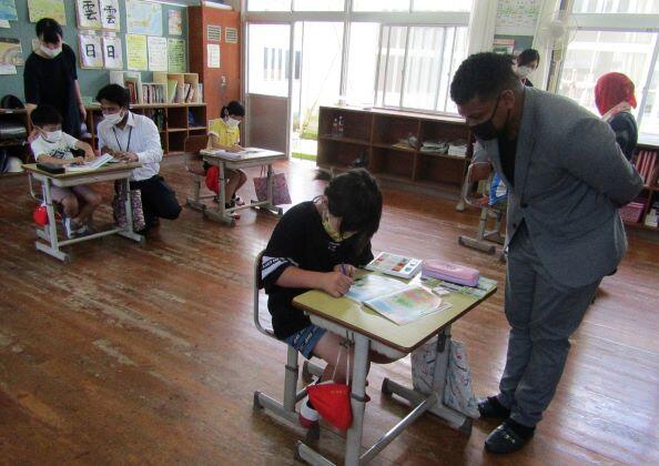 叫んでいました。(^_^;) 子どもたちのところを回りながら話しかけたり、教えたりしていました。授業の間の時間には