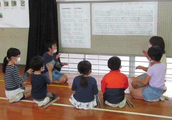 壁のリズム表を見ながら練習したり、後日、1・2年生は体育館で担任の先生と練習したり、3・4年生は教室に