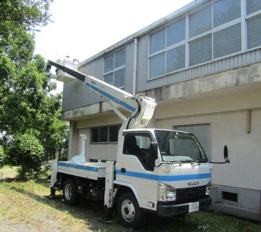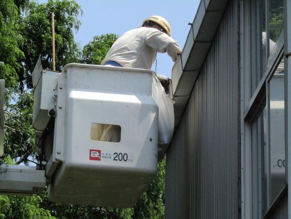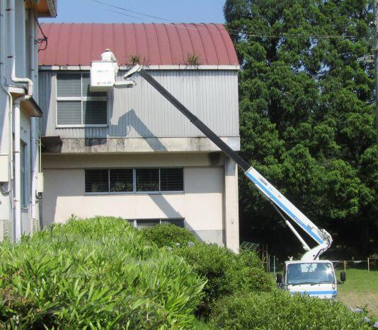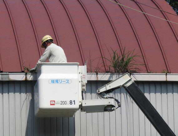 体育館の樋には草が生えていたり、落ち葉が溜まっていたりしていたので、高所作業車を使って、清掃をしていただきました。