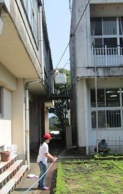 今回は2つの清掃の様子をご紹介します。まずは・・・。6月23日(水)の体育館の樋の清掃です。