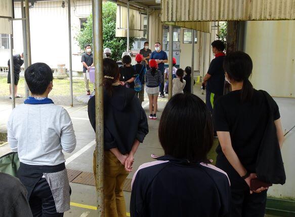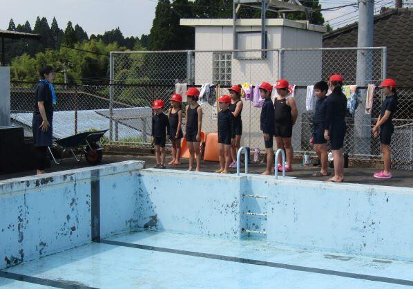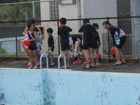 ランチルーム前に集合しました!いざ、出陣! プールサイドでPTA三役の方から説明や諸注意を聞きました。
