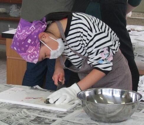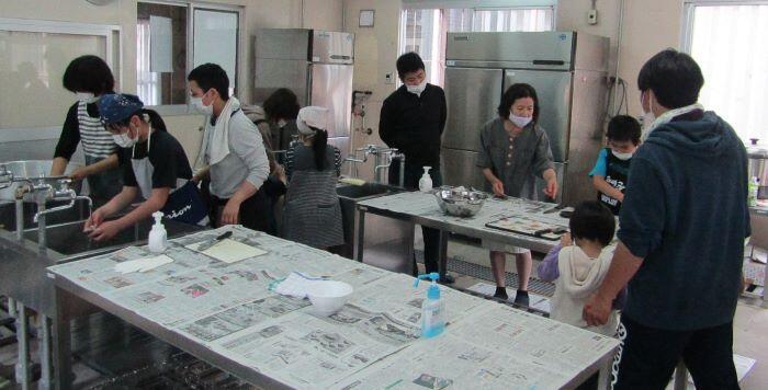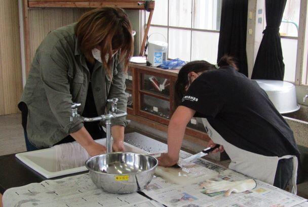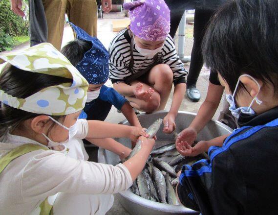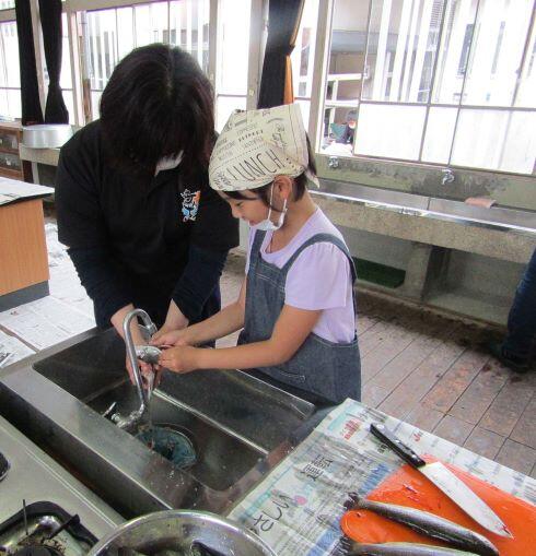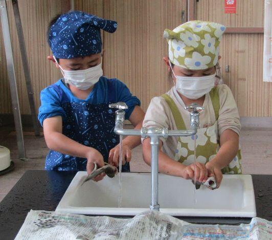 次は魚をさばきます!塩をふって、もみます。旧給食室の様子です。腹をさいて、内臓を洗い流します。