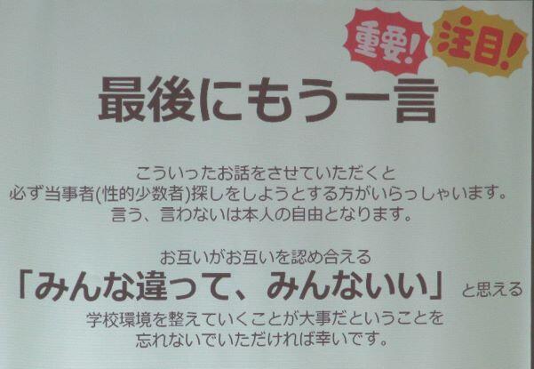 さて、では前の記事の続き、学校保健委員会です。人権に関してということで、宮崎市から LGBT交流会