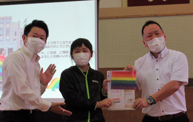 最後に児童代表がお礼を述べました。お二人からLGBTの象徴にもなっているレインボーの旗をいただきました。