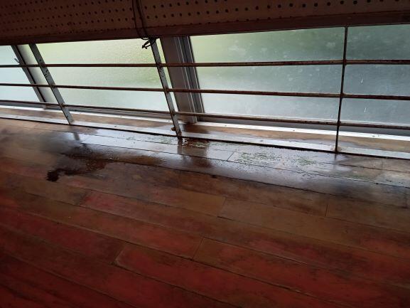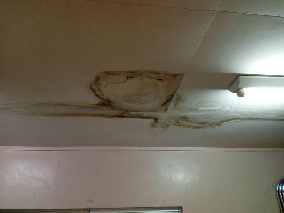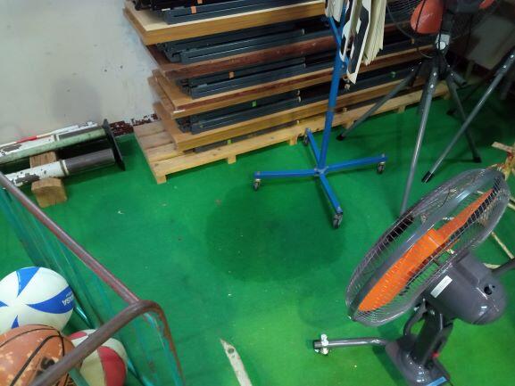 下は体育館内の倉庫です。天井から水がしみ出しています。こちらも以前から雨漏りしています。床にはシミができています。
