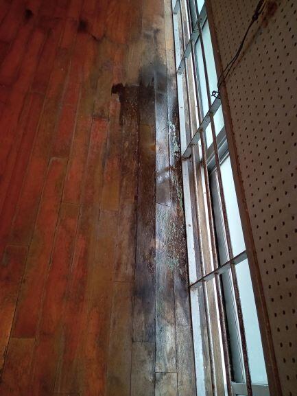 体育館の様子です。上の写真は東側のフロアです。以前から雨漏りしていた箇所がやっぱり雨漏りしていました。