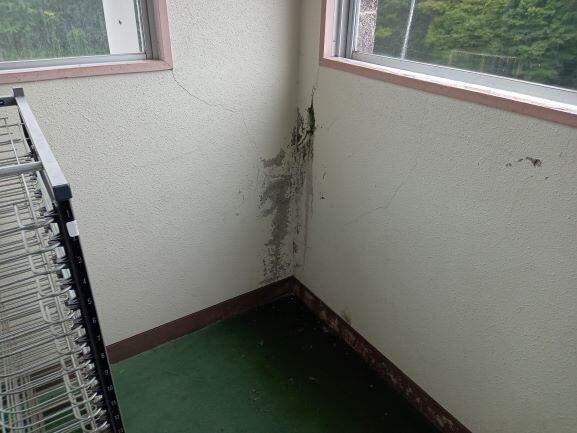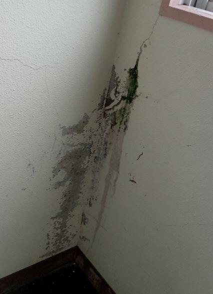 下は南校舎2階の階段を上がったところの角の部分です。ひび割れしたところから雨がしみ出しています。