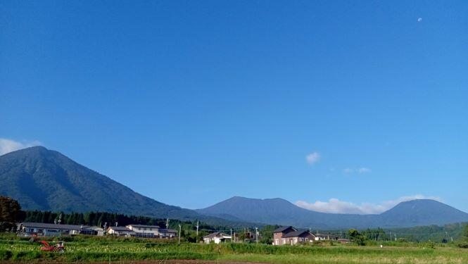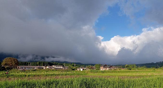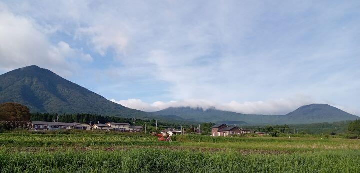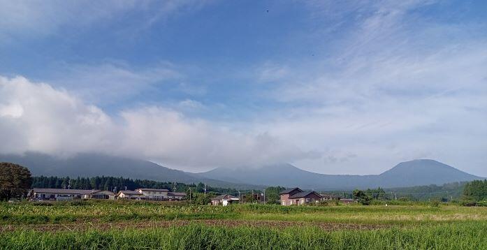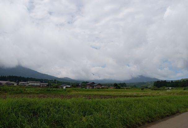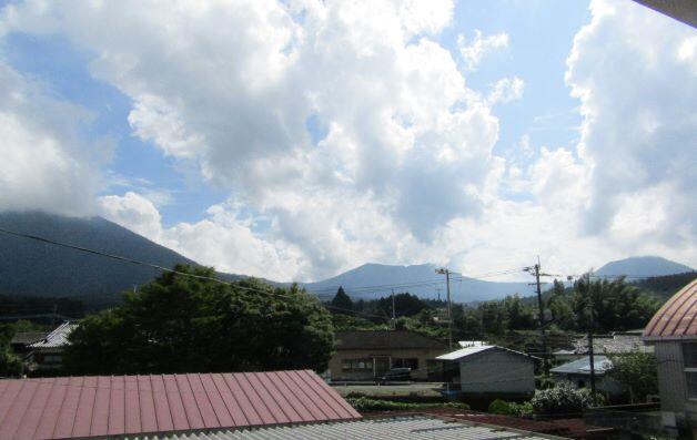 この日の朝の幸ヶ丘三岳です。雲に覆われていますが、山裾は見えました。反対側では、青空が見えていました。気温があがっています。熱中症が心配されますね。気を付けましょう。