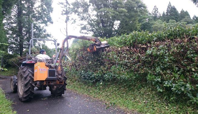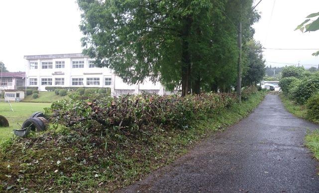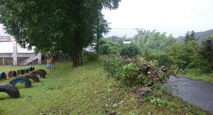 保護者の方と職員、合計7名で雨の中、行いました。背丈以上に伸びた垣根を選定しました。トリマーや剪定ばさみでは