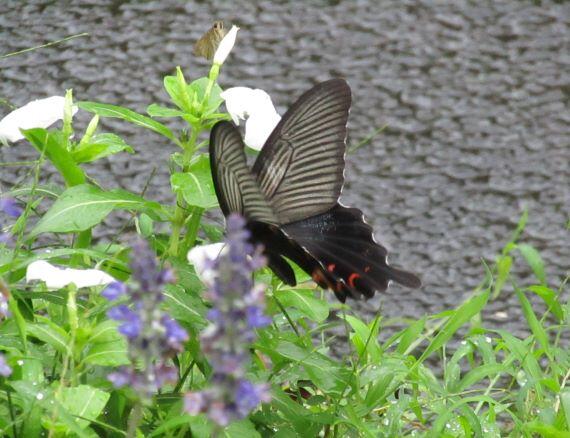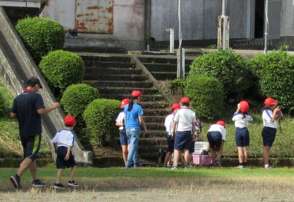 そんな晴れ間に、運動場では用務員さんと教頭先生が草刈りをしてくださいました。チョウも気持ちよく飛んでいました。