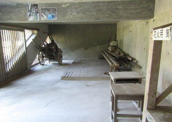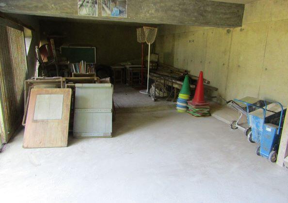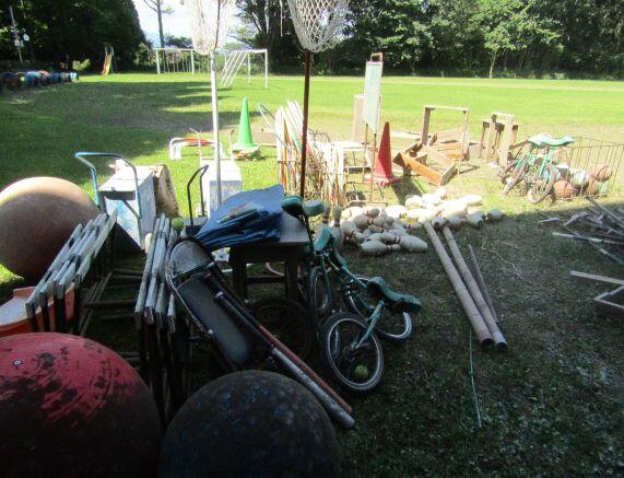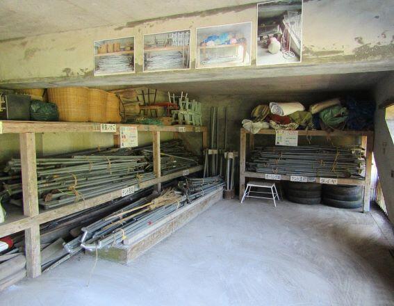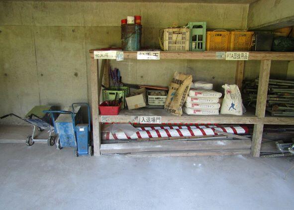 ここには、外での体育や運動会で使用する道具類が保管してあります。地区との合同運動会で使う道具もあり、