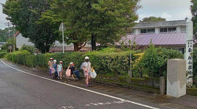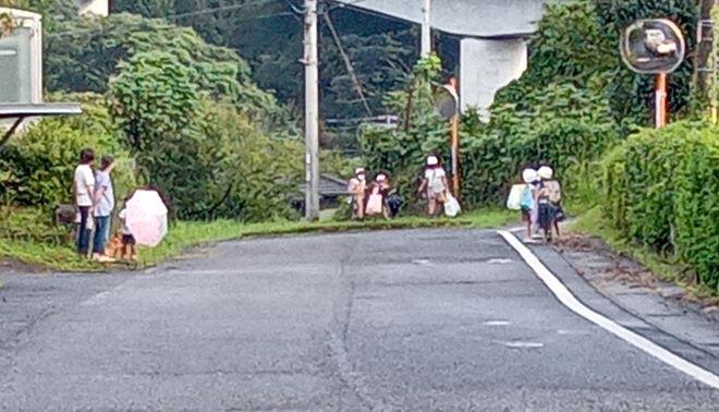 朝の登校風景です。ご近所の方も道路まで出てきて、あいさつ等をしてくださっています。