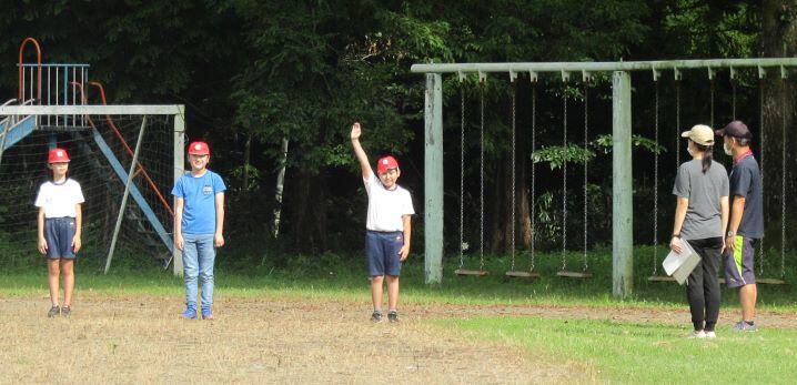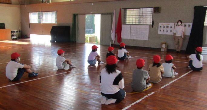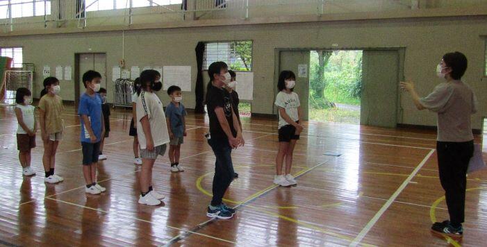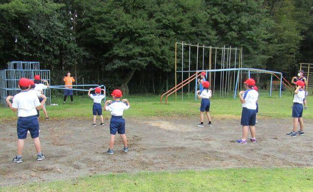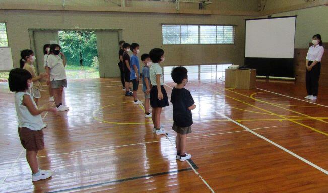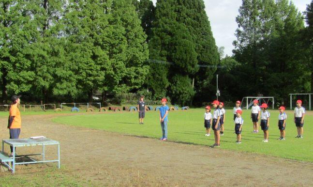 まずはラジオ体操第一です。約1年ぶりなので、一つずつ確認をしながら練習しました。1年生は初めてかな?(^_^;)