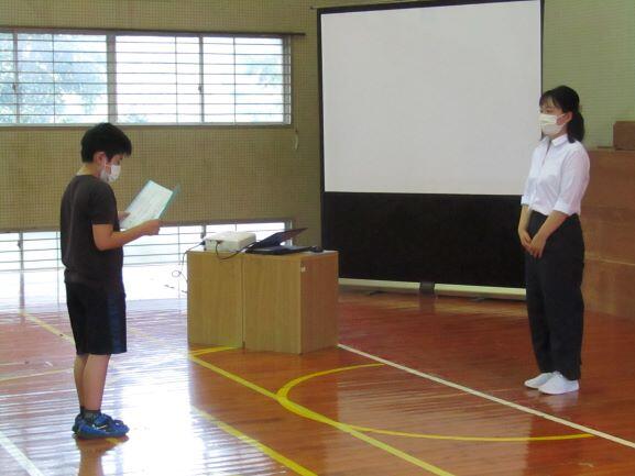 朝会の前に新しい先生(上園ユカ理先生)のご紹介をしました。ご挨拶をいただいた後、児童代表が歓迎の言葉を述べました。