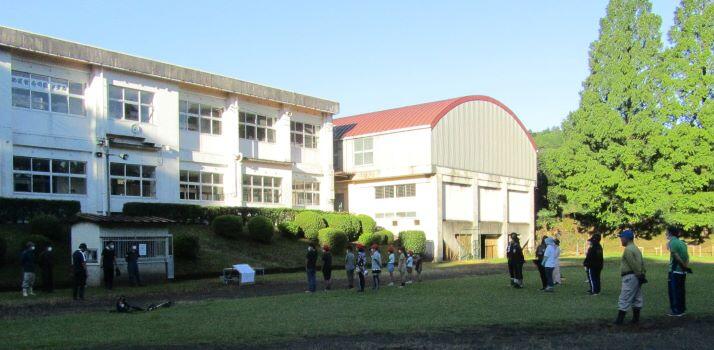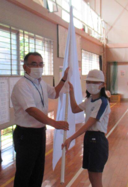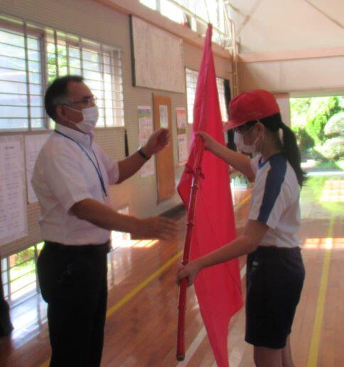 校長先生から団旗が渡されます。「お願いします!」 その後、校長先生から激励のことばがあり、各団に分かれて、