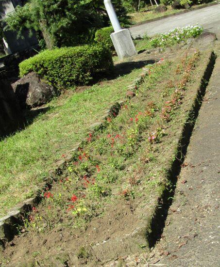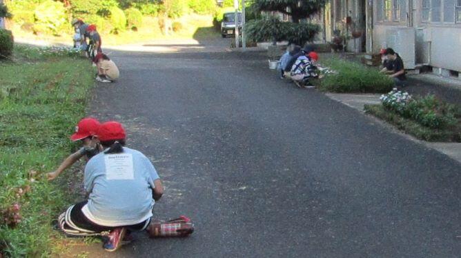 中庭は地区の方が刈ってくださいました。子どもたちは花壇の草取りです。保護者の方は運動場北側の草刈りと溝あげです。