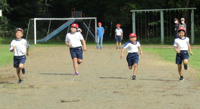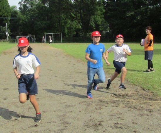 走ります!走ります! 1・2年生、3・4年生、そして5・6年生が一緒に走ります。走り前には名前を紹介するので、