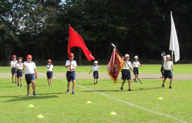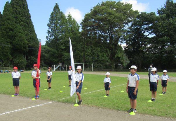 入場行進と開会式の流れをしました。運動会っていう感じがしますね!今年は人数が少ないので校旗の入場はありません。