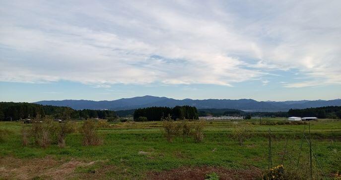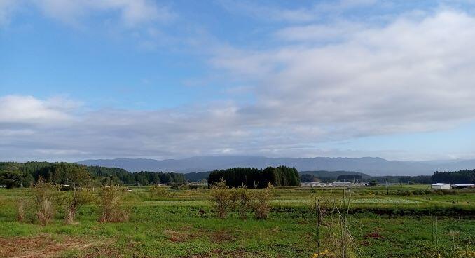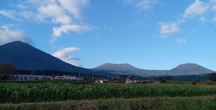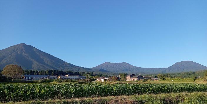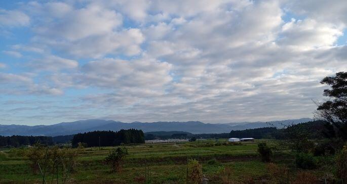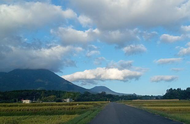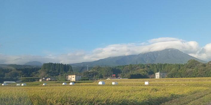 この日の通勤途中の写真では奥の方に甑岳がきれいに見えていました。両側の田んぼの稲も実っていますね。右側の田んぼの一部は稲刈りが終わって、稲が干してあります。分かりますか?