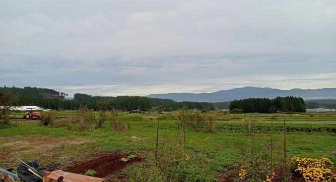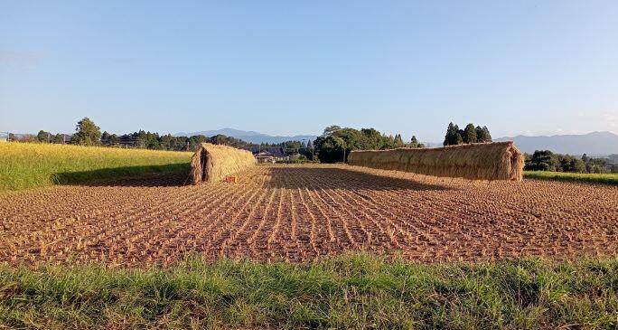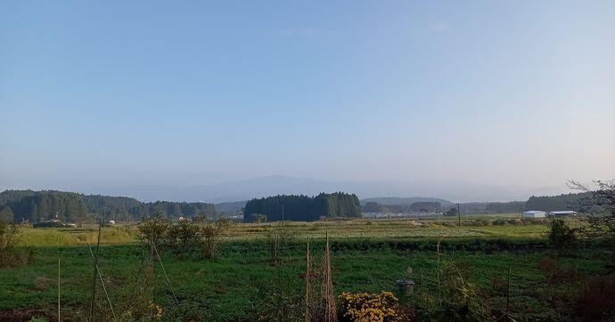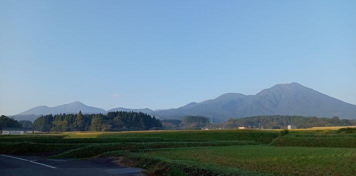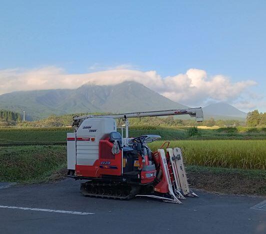 稲を刈る機械ですね。コンバインというのかな?後の田んぼの稲を刈るのでしょうか?遠くには夷守岳と甑岳が見えます。