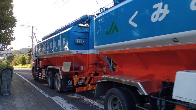 反対側には飼料作物を刈り取って束ねた白いものがありました。校門前の道路を飼料を積んだ大きなトラックが通りました。