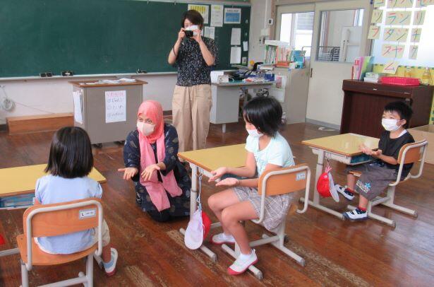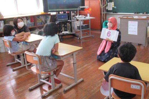 この日はALT訪問日でした。1・2年生の授業にも入ってもらいました。エムティア先生が子どもたちと視線の高さを合わせて