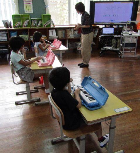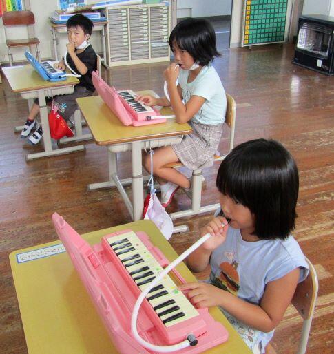1・2年生は音楽でした。鍵盤ハーモニカの練習をしていました。♫あのね、◯◯ちゃん、・・・♪ の◯◯の中に名前を