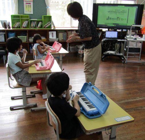 音楽の授業でした。鍵盤ハーモニカの練習でした。先生が一人ずつリズムを取りながら教えていました。なかなか